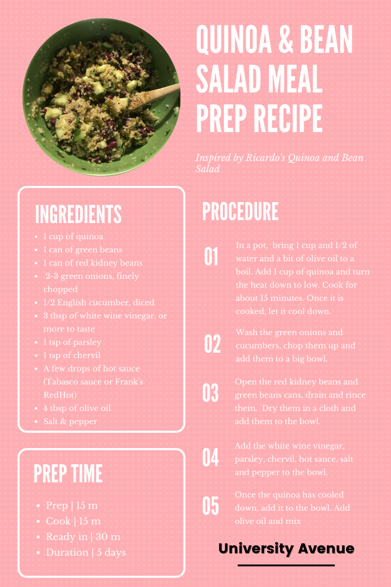 As we are getting busy with school work and life in general, it's important to remember to eat healthy. Now, I know that cooking can be the last thing on your list when you're super busy. But I do think that meal prepping is a great way to make sure you have healthy foods in the fridge, ready to grab and eat on the spot. Quick and easy! I like to meal prep on Sundays, so I have snacks and meals ready to go during the week, when I'm really busy and would not have time to cook myself a nice meal. This is why I am sharing with you this quinoa and bean salad recipe. Also cool fact but it's a vegan recipe so for all the vegans out there, check the recipe out! It takes about 30 minutes to make but it will definitely save you some time during the school week and it makes about 5 portions, so one for each day of the school week. It's perfect for a lunch or a side dish with dinner. Check out the video to view how easy and quick it is to make. Oh and while you're at it, subscribe to our YouTube Channel for any upcoming videos!