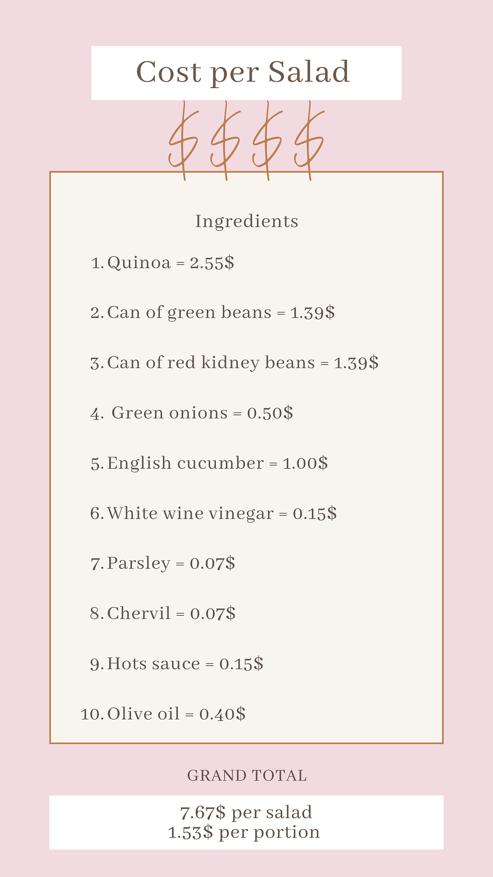 Since we're all students and most of us are careful with our money, I thought it would be nice for you to know how much it costs to make the salad. Now, obviously, the prices were adapted on a per salad basis. So you might need to buy an entire bag of quinoa before making the salad, making it more expensive at first, but you'll be able to make more than one salad with that quinoa so the cost is split up. The grand total to make the salad is 7.67$ and it makes about 5 portions, so the cost per portion is of 1.53$ ! So cheap!!!